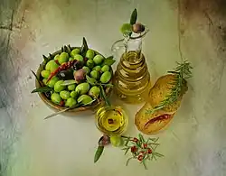 Olive oil is an important cooking oil in countries surrounding the Mediterranean, and it forms one of the three staple food plants of Mediterranean cuisine, the other two being wheat (as in pasta, bread, and couscous), and the grape, used as a dessert fruit and for wine.[24]