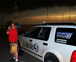 One of KOCO-TV's stormchasing vehicles outside the station's studios in Oklahoma City; as of April 18, 2013, KOCO no longer utilizes the Eyewitness News name (having rebranded as KOCO 5 News). The vehicle also features one of their Doppler weather radar brands.
