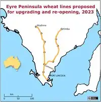 In March 2023, Aurizon and grain-handling company Viterra applied to the Australian Government for A$220 million to upgrade the abandoned lines on the lower Eyre Peninsula so that heavier, faster (and therefore more efficient) trains could operate than previously. The lines would be Port Lincoln–Wudinna and Cummins–Kimba. The proposal included upgrading of the outloading facilities at Viterra's sites at Lock, Wudinna, Cummins, Kimba and Rudall, and reducing turnaround times and increasing volume at Port Lincoln. The proposal envisaged hauling at least 1.3 million tonnes (1.4 megatons) per year and reopening within 12 months of approval of funding. Benefits would include reduction of about 25,000 t (25,000 long tons) of CO2 equivalent a year and removal of about 42,000 truck movements from Eyre Peninsula roads. General manager of operations for Aurizon, Matt Jones, said his company's business case was based on the current grain market but it welcomed any other company's freight on the railway. Rowan Ramsey, the member for the federal Division of Grey, said that while he would love to see more freight off the roads, there would need to be "a substantial business case for the rebuild of the rail line to be successful. The suggestion here is that the taxpayer stump up $220 million for one of the wealthiest companies in the world [Viterra] to build an asset only they would use. ... they were the last customer of that railway and pulled their trade maybe four years ago, ... now they want to rebuild it with taxpayers' funds for only them to use because Viterra is the only customer on that line." However, a founder of the March for Eyre group, Marie Shaw, said claims that Viterra was using taxpayers' money after they "pulled their trade" was incorrect. "What Viterra and Aurizon have done is [to say they] will together work to reopen the rail – which is actually a state government responsibility, ultimately – by [applying to] the federal government for the kind of input that the other states are getting towards regional rail. Viterra does not have any commercial arrangement with that rail, or any responsibility at all."[32][33]
