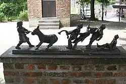 There is also another explanation. It is said there once was a farmer travelling between Mol and Geel. He had a stubborn donkey which would not move anymore. The farmer got some help from local people and they pushed and pulled the donkey to get him to move. However, they pulled so strong on the animal's tail, it broke off. This incident should have taken place in front of the little chapel "Mary in need". In this opinion, Ezaart derives from the Dutch words "ezel" (= Donkey) and "staart" (= tail). A sculpture has been placed before the chapel to remember the incident, although it is most probably an urban legend.