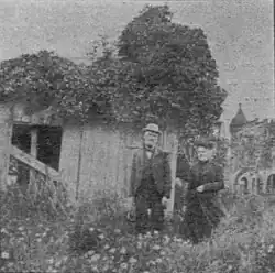 Meeker returned to the Yukon twice more, in 1899 and 1900. Most of the money earned through groceries was invested in gold mining, and was lost. When he departed the Klondike for the last time in April 1901, he left behind him the body of his son Fred, dead of pneumonia in Dawson City on January 30, 1901.[55] In his writings, Meeker ascribed his sudden departure from the Yukon in 1901 to mining losses and his upcoming 50th wedding anniversary. Meeker scholar Dennis M. Larsen in his book on the pioneer's Klondike adventure suggests that a more likely reason was attempts by those who had lost money in Meeker's enterprises in the 1890s to gain the family's remaining major asset, the Meeker Mansion.[55] That property was sold by Eliza Jane Meeker to her daughter Caroline and son-in-law Eben Osborne for $10,000 in mid-1901 (about $290,000 in 2023) and later that year both Ezra and Eliza Jane executed documents stating that the house had been her separate property, paid for with funds not deriving from Ezra. The sale to the Osbornes included provisions that Ezra and Eliza Jane were to have lifetime residence and $50 per month. Ezra Meeker did not live there after his wife's death in 1909, and the Osbornes sold the house in 1915. Eben Osborne died in 1922, survived by his 91-year-old father in law.[56]