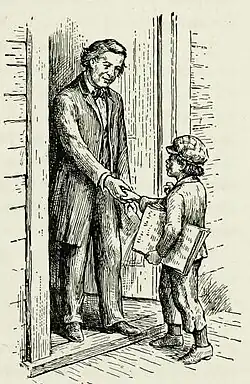 Jacob was a miller and farmer. In 1839, the family moved from Ohio to Indiana, close to Indianapolis—Ezra and his older brother Oliver walked behind the family wagon for 200 miles (320 km). Ezra had little formal education; he later estimated a total of six months. Phoebe, seeing that her son's mind was not well adapted to formal learning, allowed him to earn money through odd jobs. He obtained work as printer's devil at the Indianapolis Journal, where his duties involved delivering the newspaper to subscribers, among them local pastor Henry Ward Beecher. In 1845, Phoebe's father, a Cincinnati merchant, gave his daughter $1,000 (about $31,000 in 2023) enough to buy the family a farm. As both Jacob and Ezra Meeker realized the boy enjoyed the outdoor life more than inside work, Jacob placed Ezra in charge of the farm, allowing the elder Meeker to work as a miller.[2][5]