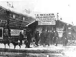 Meeker spent part of the winter of 1895–1896 in London, recouping what he could from his interests there.[51] In the 1896 Klondike Gold Rush, gold was discovered both in Alaska and in Canada, and when Meeker returned from the United Kingdom, he found his sons, Marion and Fred, preparing to leave for Cook Inlet, Alaska. They found all the worthwhile claims had already been taken. Nevertheless, the Meeker family saw the finds as a possible road to financial recovery, and founded a company to buy and sell mining claims, though they knew little about the trade. In 1897, Meeker and his sons journeyed to the Kootenay country of southeastern British Columbia, where gold had been found. Despite the fact Meeker was aged 66, he undertook a full share of the labor. Both Meeker sons filed claims in Canada, but the mines required additional investment. Meeker raised money to travel to New York to speak with his old contacts, where he received more promises than cash. On the return leg he failed to raise money in visits in Illinois and Minneapolis and by July 1897, he was back in the Kootenays, working the claim. When the gold discovery in the Klondike in northwestern Canada was publicized that year, Meeker saw that as a better opportunity, and sent his son Fred to investigate. Fred Meeker returned with a report in November; the Meekers sought to finance a mining expedition to the Klondike, but failed to raise adequate money from investors.[52]