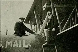Recovered, the nonagenarian Meeker began making fresh travel plans.[100] With the International Air Races to be held at Dayton, Ohio, in 1924, Meeker tried to get the War Department to allow him to fly there. He was successful, and flew with the Army pilot, Oakley G. Kelly. At a stop in Boise, Meeker quipped they were making better time than with his ox team, and in Dayton met aviation pioneer Orville Wright, to whom he commented, "You'd be surprised at the difference between riding in a Prairie Schooner and in an airplane."[101][102] The publicity was so favorable that the Army had Kelly fly Meeker the rest of the way to Washington, D.C., where the onetime pioneer met President Calvin Coolidge in October 1924. Meeker returned to Seattle by train.[101][103] Wanting the government to build a road over Naches Pass, where he had guided his father's party seventy years before, Meeker ran for the Washington House of Representatives in 1924 from the 47th district but was defeated in the Republican primary by 35 votes.[43][104] In 1925, Meeker drove an ox team for several months while touring in J.C. Miller's Wild West Show.[105]