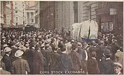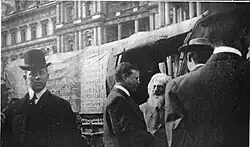 After a visit to Eddyville, Iowa, from where he had set out in 1852, Meeker spent several weeks in Indianapolis, leaving on March 1, 1907, when his permit to sell on the streets there expired. With the Oregon Trail run completed, he proceeded east through Ohio, Pennsylvania, and New York State, seeking to both raise public awareness and earn some money for himself through sales of his merchandise. He often spent several days in a location, so long as sales of postcards and books flourished.[82] When the expedition reached New York City, Mayor George B. McClellan Jr. was absent but the acting mayor told Meeker that, although he could not grant him a permit, he would instruct the police not to molest him. The message was apparently not well-communicated, as at 161st and Amsterdam Avenue a policeman arrested Meeker's helper, Mardon, for driving cattle upon the streets of New York in violation of a local ordinance. A stalemate followed as Meeker refused to move his oxen and the police had no means of doing so. The situation was resolved when higher authority ordered Mardon's release. Meeker wanted to drive the length of Broadway; it took a month to get the legal problems resolved. It took him six hours to drive the length of Manhattan. He had arranged with the press for photographers, who took shots of him at the New York Stock Exchange and the sub-Treasury building across Wall Street. Later in his stay, he drove across the Brooklyn Bridge.[83]