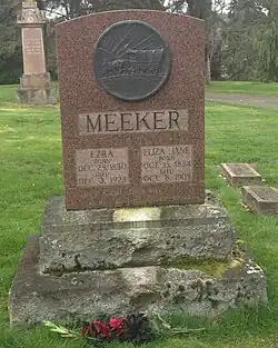Meeker was again advocating better roads, and gained the support of Henry Ford,[110] who built him a Model A car with a covered wagon-style top, dubbed the Oxmobile, to be used in another expedition over the Trail to publicize Meeker's highway proposals. In October 1928, Meeker was hospitalized with pneumonia in Detroit. He returned to Seattle, where he fell ill again. Meeker was taken to a room in the Frye Hotel, where he told his daughter Ella Meeker Templeton, "I can't go. I have not yet finished my work."[73][109][110] Ezra Meeker died there on December 3, 1928, just under a month short of his 98th birthday. His body was taken in procession back to Puyallup, where he was interred beside his wife Eliza Jane in Woodbine Cemetery. Under a plaque based on the Oregon Trail Memorial coin Ezra Meeker had inspired, their gravestone, erected by the OTMA in 1939, reads, "They came this way to win and hold the West."[109][111][112]