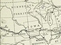 A number of Oliver Meeker's friends from Indianapolis joined the group before the party left Iowa.[10] They crossed the Missouri River at the small Mormon settlement of Kanesville (today Council Bluffs, Iowa). Meeker recounted that, as he stood on the far side of the Missouri, he felt as if he had left the United States. As they journeyed westward along the Platte River in Nebraska Territory, there were such large numbers traveling that they were never out of sight of the tens of thousands of other pioneers journeying west that year.[14] Sometimes several wagons advanced side by side.[15] The Meekers chose a slow, steady pace, unlike many who sought to rush along as quickly as possible. Piles of abandoned possessions lined the way, cast aside to lighten loads. As the party went further west, they passed some of those who had hurried past them, and whose wagons had broken down or whose oxen had died as a result of failure to care for them properly. Disease was an ever-present risk; at the present site of Kearney, Nebraska, Oliver Meeker was stricken with illness. This led to a division of the group when most of Oliver's friends, including later Idaho Territory governor David W. Ballard, refused to wait. Oliver recovered after four days, and was one of the lucky ones—his brother later estimated that one in ten of those who took the Trail perished during the journey. Ezra Meeker remembered meeting one wagon train, slowly moving east against the flow of traffic. That group had made it as far as Fort Laramie (today in Wyoming) before losing the last of its menfolk, and the women and children turned back, hoping to regain their homes in the East. He never learned if they made it.[10][14] According to local historians Bert and Margie Webber, "all of these deaths made a great impression on the young man".[15]