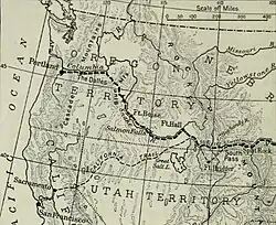 That April, Ezra, Eliza Jane, Oliver, and Marion Meeker set out to journey to Oregon, some 2,000 miles (3,200 km) in all.[11] With their wagon, they had two yokes of oxen, one of cows and an extra cow. They were accompanied by William Buck, who would remain with them much of the way before separating from them to go to California.[9] Buck outfitted the wagon, Meeker selected the animals, and with his wife carefully prepared food supplies.[12] The wagons of Meeker's grouping traveled together by informal agreement; there was no wagon master in overall charge.[13]