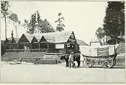 Despite his inability to raise funds for mining, Meeker was certain there was a way to make money from the gold rush. He and Eliza Jane spent much of the winter of 1897–1898 drying vegetables, and Ezra Meeker departed for Skagway, Alaska, on March 20, 1898, with 30,000 pounds (14,000 kg) of dried produce—Fred Meeker and his wife Clara were already across the border in what would soon be designated as the Yukon Territory. The 67-year-old Meeker, with one business associate, climbed the steep Chilkoot Pass. With thousands of others in boats and on rafts, he floated down the Yukon River once the ice broke up in late May, and sold his vegetables in two weeks in Dawson City. He returned to Puyallup in July, only to set out again with more supplies the following month. This time, he and his son-in-law, Roderick McDonald, opened a store, the Log Cabin Grocery, in Dawson City, and remained through the winter.[53][54]