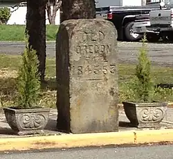 The first stop after Olympia for "The Old Oregon Trail Monument Expedition" was Tenino, Washington, where Meeker went ahead by train on February 20, 1906, to make arrangements for the first monument of the trip. He still had no driver, and had his wagon pulled to Tenino by horses, with the oxen trailing behind. He appealed to a local quarry for a suitable stone, which was carved and was dedicated in Tenino at a ceremony on the 21st.[69][70] He had less success as he journeyed south towards Portland; at none of the remaining Washington stops was a monument erected, and although Meeker placed wooden posts where monuments should go, most of the designated towns did not follow through. The lack of enthusiasm about Meeker's mission continued in Portland, where the Unitarian church elders voted against allowing Meeker the use of the building to give a fundraising lecture, pledging to do nothing to "encourage that old man to go out on the Plains to die".[71]
