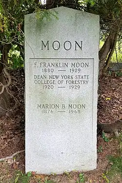 Moon died on September 3, 1929.[8] Moon is buried in Oakwood Cemetery - adjacent to the SUNY College of Environmental Science and Forestry campus. His headstone overlooks the campus.
