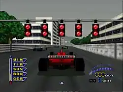 The car can be controlled with either the analog stick or D-pad on the standard Nintendo 64 controller.[2] Weather is variable, and inclement weather can occur in the middle of a race.[2] On the bottom left corner of the screen are different indicators for car conditions: a fuel gauge and five indicators, one for each part of the car (in order: wings, tires, suspension, brakes and gearbox), all of which change color according to the car's condition, from blue to yellow to red to flashing red. When an indicator reaches flashing red, the player risks retiring from the race if it isn't fixed in time.