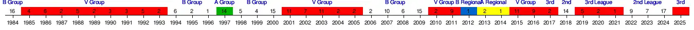 | Green marks a season followed by promotion, red a season followed by relegation. | |||||||||||