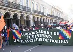 To mobilize support for the constitution, the FEJUVE came together with other social movements to found the National Coalition for Change (CONAL-CAM), working together with the COB as part of a popular front. The FEJUVE had found itself undergoing a shift from its former confrontational position to a "constructive but critical collaboration" with the MAS government.[35] The FEJUVE's collaboration with the government has since resulted in a new public housing program for El Alto, with the FEJUVE and COB pushing for the integration of participatory planning into the process.[36] The Ministry of Production and Microenterprise has also provided support for El Alto's social enterprises, which are organized along the traditional lines of participatory democracy. This process resulted in the extension of workers' control over the economy, with FEJUVE and COB arguing for the program's expansion to El Alto's smaller businesses. This new model of "Andean capitalism" intended to utilize surplus funds from nationalized resources to promote community self-organization and workers' self-management.[37]