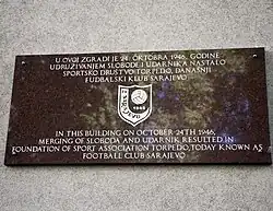 FK Sarajevo was established on 24 October 1946, at a meeting held in the main hall of the FIS building, as the result of a merger between local Sarajevo football clubs Udarnik (Vanguard) and Sloboda (Liberty).[17] The club first appeared on the Yugoslav sports scene in 1946 under the name Fiskulturno društvo Torpedo (English: Gymnastics Society Torpedo), a homage to Torpedo Moscow. The first chairman of the newly founded club was Safet Džinović, while the positions of vice-chairmen were granted to Vojo Marković and Alojz Stanarević respectively. Furthermore, Josip Bulat was named manager.[18]