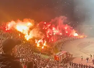 FK Sarajevo plays at the Asim Ferhatović Hase Stadium, formerly known as the Koševo Stadium. It is owned by the City of Sarajevo but is leased to the club on a long-term basis. The club runs and operates the stadium and has sole commercial and developmental rights to the Olympic complex until at least 2051, with the possibility of a further 15-year extension.[83] The current seating capacity is 30,121. The stadium was opened in 1947 and named after the Sarajevo neighborhood of Koševo, where it is located.[84] The stadium was literally buried into a local hill thus merging with its natural surroundings. In 1950 a pitch and a tartan track were also added. The first international football match at the stadium was played between Yugoslavia and Turkey, in 1954.