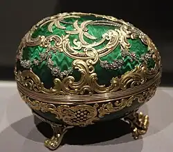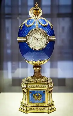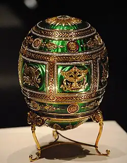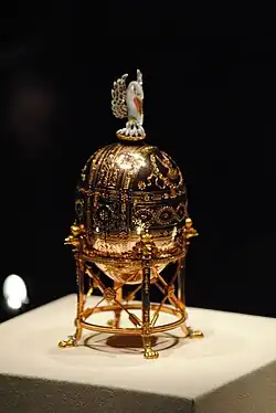 A Fabergé egg (Russian: яйцо Фаберже, romanizedyaytso Faberzhe) is a jewelled egg first created by the jewellery firm House of Fabergé, in Saint Petersburg, Russia. As many as 69 Czarist Russia Era eggs were created, of which 61 are currently known to have survived.[1] Virtually all of the original first edition eggs were manufactured under the supervision of Peter Carl Fabergé between 1885 and 1917.[2][3] The most famous of the firm's creations are the 50 delivered Imperial Easter eggs,[4][5] of which 44 are currently known to be in complete or partial physical existence, leaving the fate of those remaining unknown.