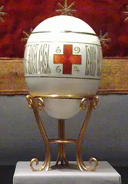 Prior to 1885, Emperor Alexander III gave his wife Empress Maria Feodorovna jeweled Easter eggs.[8] For Easter in 1883, before his coronation, Alexander III and Maria Feodorovna were given eggs, one of which contained a silver dagger and two skulls.[9] The egg came with messages including "Christ is risen" and "You may crush us—but we Nihilists shall rise again!"[9]