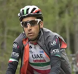 Fabio Aru (born 3 July 1990) is an Italian former professional road bicycle racer, who rode professionally between 2012 and 2021 for the Astana, UAE Team Emirates and Team Qhubeka NextHash squads.[6] He hails from San Gavino Monreale in Sardinia, and is known for his climbing ability, which made him a favorite for the Grand Tours. He is known as "The Knight of the four Moors", a reference to his native island of Sardinia.