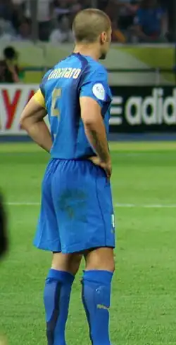 Cannavaro captained Italy throughout their successful 2006 World Cup campaign with composure and aplomb under manager Marcello Lippi. One of his key performances came in a 2–0 extra-time win against hosts Germany in the semi-finals of the tournament: in the last minute of extra-time, with Italy leading 1–0 and facing a German attack, Cannavaro outjumped Per Mertesacker to clear the ball from his area. He subsequently ran forward to dispossess Lukas Podolski, and carried the ball up to Francesco Totti in midfield, who started the play that led to Italy's second goal, which was scored by Alessandro Del Piero from an assist by Alberto Gilardino.[41] However, Cannavaro's crowning moment was lifting the World Cup trophy on 9 July 2006, the night of his 100th cap.[42] Cannavaro did not receive a single yellow or red card during the 690 minutes he played in the tournament. His defensive performance in the final earned him the nickname of "Wall of Berlin", as the final was played in Berlin.[9][41][43]