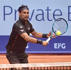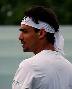Fabio Fognini (Italian pronunciation: [ˈfaːbjo foɲˈɲiːni];[4] born 24 May 1987) is an Italian former professional tennis player. He has a career-high ATP ranking of world No. 9 achieved on 15 July 2019. Fognini's most successful surface is red clay, where he has won eight of his nine ATP singles titles, most notably at the 2019 Monte-Carlo Masters. He also reached the quarterfinals of the 2011 French Open. Together with Simone Bolelli, Fognini won the 2015 Australian Open doubles championship, becoming the first all-Italian men's pair to win a Grand Slam title in the Open Era.[5]