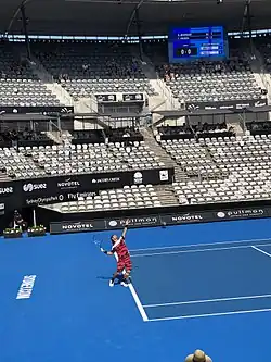 At the US Open, after a first round loss to Stefano Travaglia, Fognini was immediately suspended from the tournament for unsportsmanlike conduct, specifically three violations including using misogynistic language towards the female umpire.[29] This caused him to default his third round doubles match with partner Simone Bolelli. On 11 October, the Grand Slam board provisionally suspended Fognini for two majors and fined him US$96,000 for a "Major Offence of Aggravated Behaviour." The fine will be halved and the ban of two majors will be lifted if good behavior is maintained through 2019.[30][31][32]