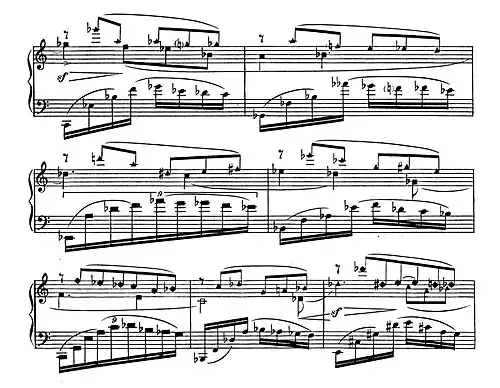 Henry Cowell's 1920 work Fabric, HC 307, is a short piano piece meant to be an exercise in a form of experimental rhythmic notation he had been developing at the time.