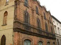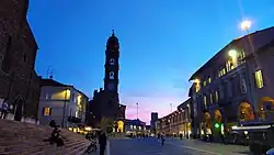 The Civic Tower (or Clock Tower), located at the entrance to Piazza del Popolo at the intersection of the Roman cardo and decumanus of Faventia, is one of the city's most iconic architectural landmarks. The original design is attributed to Friar Domenico Paganelli, who began its construction in 1604 on a 16th-century rusticated base. The tower is quadrangular, with five superimposed orders and crowned by a dome. At its base, within a niche featuring a balcony with an elegant wrought iron and brass railing, is a marble statue of the Madonna with Child by Francesco Scala, dated 1611.[34] The original tower was destroyed by retreating German forces in November 1944. The current structure is a faithful reconstruction from 1953, retaining the original 17th-century Madonna and Child statue, which survived the collapse.