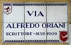 Typical toponymic plaque in maiolica from one of the streets in the historic center, featuring the municipal coat of arms in the top left and the coat of arms of the respective district in the bottom right