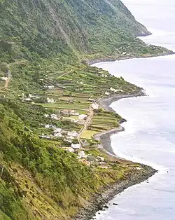 A view of the Fajã from the coastal roadway leading down to the village | |