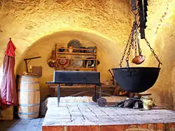 Originally, a wooden bridge used to connect the bergfried about 9 metres above the ground to the palas located in the northwest corner. Later (Gothic) alterations connected the buildings.[3]: 99