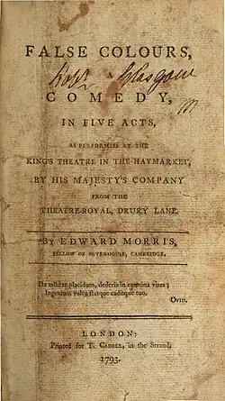 False Colours is a 1793 comedy play by the British writer Edward Morris. It premiered at the Theatre Royal, Haymarket in London on 3 April 1793.[1] [2] The original cast included Richard Suett as Lord Visage, Thomas King as Sir Paul Panick, Richard Wroughton as Sir Harry Cecil, William Barrymore as Captain Montague, John Bannister as Grotesque, Robert Palmer as Subtle, Ralph Wewitzer as Tony, Walter Maddocks as Alfred, Jane Pope as Lady Panick, Elizabeth Farren as Constance, Charlotte Goodall as Harriet and Elizabeth Heard as Lucy.