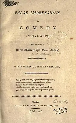 False Impressions is a 1797 melodramatic comedy play by the British playwright Richard Cumberland. It was first staged at the Covent Garden Theatre in November 1797. Much of the plot resembles Cumberland's 1795 novel Henry.[1] Algernon has to pretend to be a servant to restore his good name.