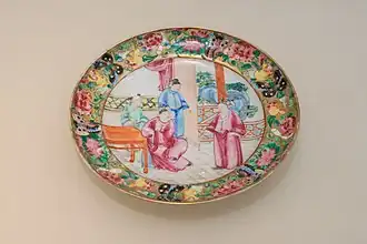 Famille rose enamels were known to have been used in Europe before its usage became established in China, for example in Vienna porcelain made by the Du Paquier factory in 1725.[9] Large number of famille rose porcelains were exported from China to the West, and many European factories such as Meissen, Chelsea and Chantilly copied the famille rose palette used in Chinese porcelain.[19] Export of Chinese porcelain then declined due to competition from the European factories.