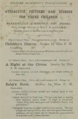 ![]() Advert for F. M. Gallaher's books for children in 1889 | |