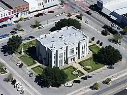 The Fannin County Courthouse is a historic courthouse building located in Bonham, Fannin County, Texas. Built in 1888-1889 of rough-cut local limestone from Gober by Scottish-born stonemasons Kane and Cormack, it was designed in the Second Empire style of architecture by Waco-based architect Wesley Clark Dodson (1829–1914) of the firm Dodson and Dudley. As built it was similar in appearance to the Hood County Courthouse Dodson designed shortly after it.[1] Its central clock tower and elaborate mansard roof were destroyed by fire on New Year's Eve, December 31, 1929, and were replaced by a flat roof.[2] In 1965 the courthouse was modernized, the remaining roof pediments were removed and the exterior was covered with a smooth surface of what is called Lueders stone or Lueders limestone, so that it appeared to be a Moderne or rather plain Art Deco building.[3] [4] [5]