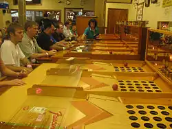 Fascination is a game commonly found in North American amusement parks, boardwalks and arcades. The game is a redemption game, in that prizes are often won for playing the game. The game dates to 1918, with the first location opening at Coney Island, NY.[1] It became popular during the 1920s and spread quickly from coast to coast, as evidenced in pictures of Chutes at the Beach in San Francisco, a park that operated from 1903 - 1928 (when it became Playland at the Beach). Over a century later, there are still a handful of locations that are in operation, mostly in the Northeastern US.