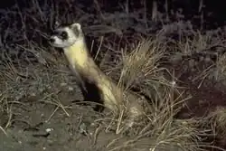 Associated with the eradication program of the prairie dog (gopher) in the 1930s was the dramatic decline in population of the black-footed ferret (Mustela nigripes) which relied on the prairie dog as its main source of food. The lowered population was hastened as the natural habitat of the ferret was also being taken over by agricultural machinery and practices.[71][72][84]