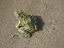 Typical reptiles in the Mixed Grassland ecoregion are the horned lizard (Phrynosoma), common garter snake (Thamnophis sirtalis), common snapping turtle (Chelydra serpentina), and prairie rattlesnake, and western painted turtle (C. p. bellii).[4][53][54][55][63] The leopard frogs (Rana pipiens) and chorus frogs (Pseudacris) are typical amphibians of the Grasslands National Park.[64]