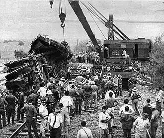 - At least 236 people were killed, and 360 injured in Argentina's worst railroad disaster.[2] The high speed luxury train "La Mixta" was 25 miles (40 km) north of Buenos Aires at the end of a 925 mi (1,489 km) trip from Tucuman, and carried about 400 passengers in 21 rail cars. Ahead, a commuter train that was crowded with 1,000 passengers in 10 crowded cars, had stalled on the same tracks, but there was no signal to warn the luxury train, which was moving at 65 miles per hour (105 km/h) before impact. Most of the casualties of the wreck were on the commuter train.