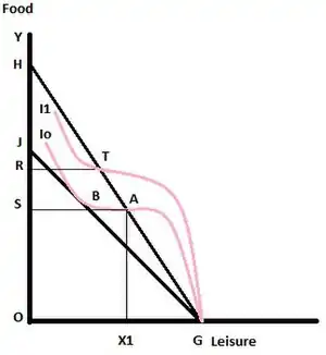 To understand this better, we refer to the graph in this section, which shows Food on the vertical axis and Leisure on the horizontal axis. OS represents the subsistence level of food consumption, or the minimum level of food consumed by agricultural labor that is necessary for their survival. I0 and I1 between the two commodities of food and leisure (of the agriculturists). The origin falls on G, such that OG represents maximum labor and labor input would be measured from the right to the left. The transformation curve SAG falls from A, which indicates that more leisure is being used to same units of land. At A, the marginal transformation between food and leisure and MPL = 0 and the indifference curve I0 is also tangent to the transformation curve at this point. This is the point of leisure satiation.