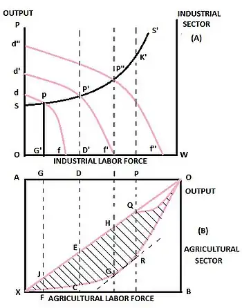 The Fei–Ranis model of economic growth is a dualism model in developmental economics or welfare economics that has been developed by John C. H. Fei and Gustav Ranis and can be understood as an extension of the Lewis model. It is also known as the Surplus Labor model.[1] It recognizes the presence of a dual economy comprising both the modern and the primitive sector and takes the economic situation of unemployment and underemployment of resources into account, unlike many other growth models that consider underdeveloped countries to be homogenous in nature.[2] According to this theory, the primitive sector consists of the existing agricultural sector in the economy, and the modern sector is the rapidly emerging but small industrial sector.[3] Both the sectors co-exist in the economy, wherein lies the crux of the development problem. Development can be brought about only by a complete shift in the focal point of progress from the agricultural to the industrial economy, such that there is augmentation of industrial output. This is done by transfer of labor from the agricultural sector to the industrial one, showing that underdeveloped countries do not suffer from constraints of labor supply. At the same time, growth in the agricultural sector must not be negligible and its output should be sufficient to support the whole economy with food and raw materials. Like in the Harrod–Domar model, saving and investment become the driving forces when it comes to economic development of underdeveloped countries.[2]