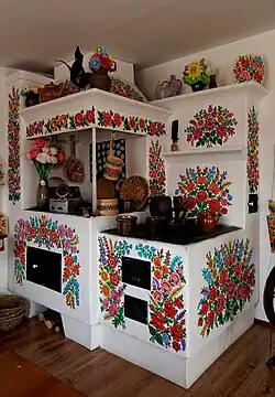 Born in Zalipie in 1904, Curyłowa painted every available surface in her home with floral ornamental painting. She painted directly on the plaster, on paper, carpet, and utilized cut-outs. She also created traditional cloths and items made of tissue paper.[2] Besides painting, she also practised various decorative crafts. Curyłowa was also asked to paint the interior of the Wierzynek restaurant in Kraków and the dining room on the MS Batory cruise ship. Her designs were reproduced commercially as decorations on china.[3]