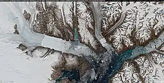![]() View of the Helheim, Fenris, and Midgard glaciers at the northern end of Sermilik Fjord. | |