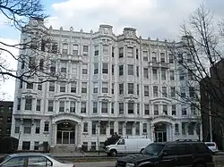 When planned, it was thought that the buildings built upon the Fenway would house high-wealth residents and that the whole area would be a high-class neighborhood.[8] As property values rose, however, it was educational institutions that sprung up along the Fenway's route. By 1907, there were twenty-two educationally focused organizations, including nine college and universities which had made their homes on the Fenway.[8] Residential buildings that were built needed their frontages to be approved by the Park Board so that a "poor looking building [did not] depreciate the value of the whole neighborhood".[9] Additionally, the Board had discretion on whether it felt a proposed building was suitable for frontage along the park and parkway. The hope of these building restrictions was that there would be an improvement in the look of the Fenway compared to neighboring streets.[9]