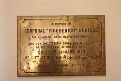 - ^ "VC awarded to Corporal Christian Ferdinand Schiess, 2nd Battalion, 3rd Natal Native Contingent, for gallantry during the defence of Rorke's Drift, 22-23 January 1879". Archived from the original on 14 June 2014. Retrieved 12 April 2013.