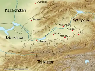 ![]() Fergana Valley (highlighted), post-1991 national territories colour-coded. | |