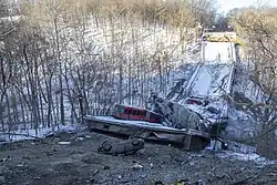 Five vehicles were on the bridge when it collapsed, including a PRT articulated bus built by New Flyer in 2013. Another passenger vehicle drove off the eastern bridge abutment after the collapse and came to rest on its roof.[14] At least 10 people were injured; three were taken to hospitals by ambulances. None of the injuries appeared to be life-threatening.[23] Some first responders rappelled about 150 ft (46 m) into the ravine, while others formed a human chain to rescue victims.[1] According to a law enforcement official, a passing jogger helped to rescue some of the motorists.[27] The count of ten injured included some first responders who slipped and fell during the rescue operation.[28] The initial rescue effort was completed by 8:30 a.m. EST while emergency personnel continued to check under the wreckage for any trapped victims;[1] none were found.[25] A crane erected at Forbes and Briarcliff was used to retrieve the wrecked vehicles, and the bus (22 tons) was lifted from the site on January 31.[29][30]