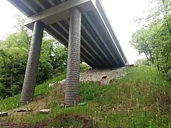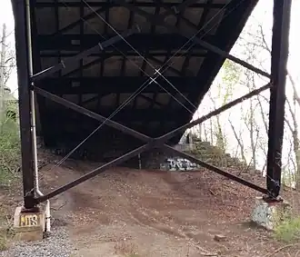 The bridge used two welded steel girders, supported at each end on reinforced concrete caps poured atop stone masonry abutments; the deck was supported by welded steel floor beams and rolled steel stringers. The rigid frame supports were inclined welded steel legs resting on reinforced concrete thrust blocks. The structural steel in the bridge and its inclined supports was not coated, as the weathering steel used was designed to develop a protective patina over time.[14]