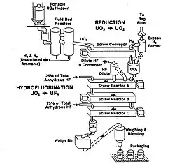 The uranium dioxide in the reduction furnace passed through a seal hopper and a feed screw to the first of the three hydrofluorination furnaces. The operating temperate of each was higher than the one before, with the first operating at about 149 °C (300 °F) and the third at around 649 °C (1,200 °F).[34]